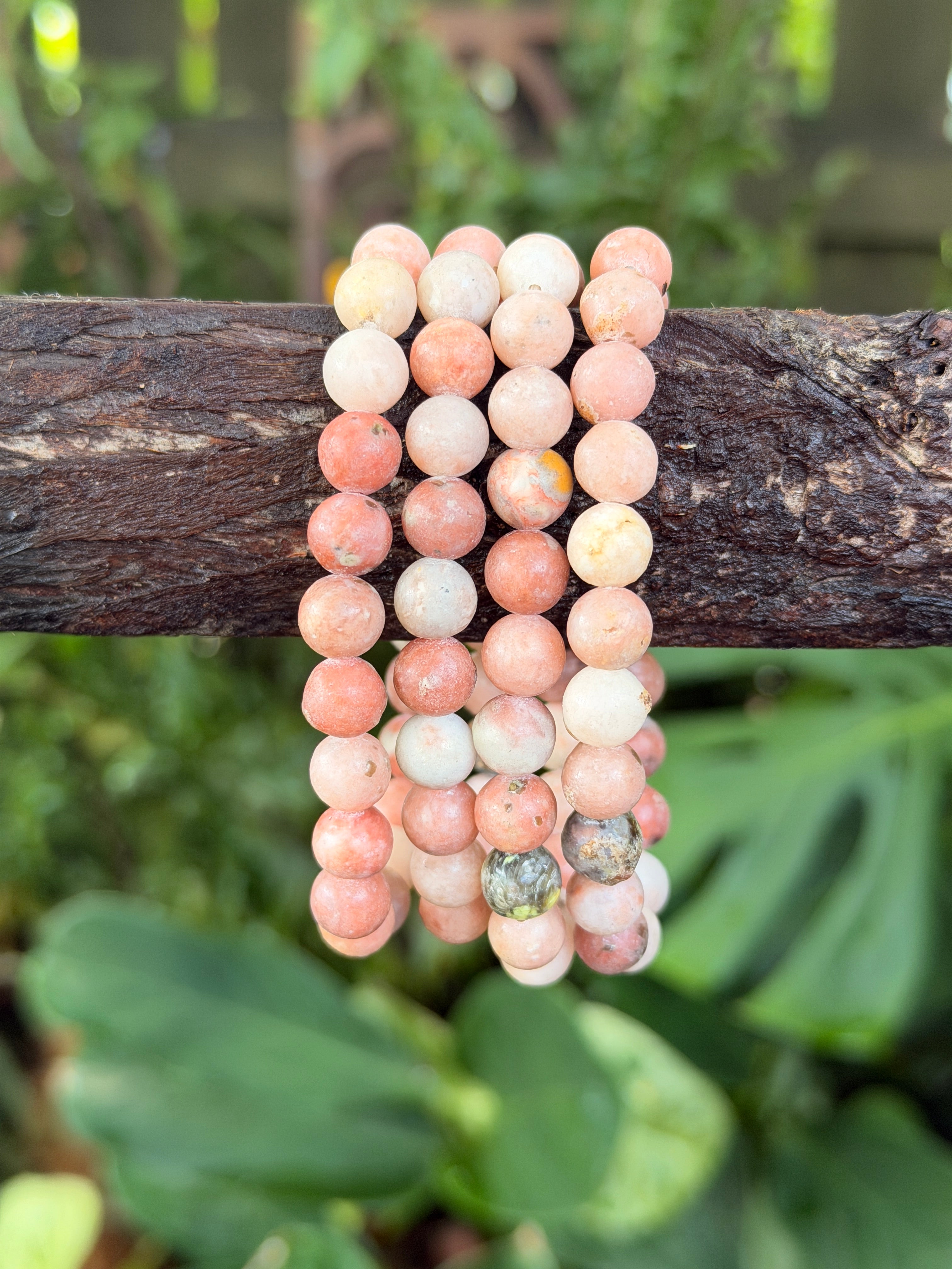 Elastic jewellery pieces should not be worn in the water (Ocean, Shower ect.) and taken off at night when sleeping (trust me.... trying to find beads that have scattered through a bed is not fun). Also, try to limit the amount of times they are stretched to full length, as this can cause excess wear and fraying on the elastic.