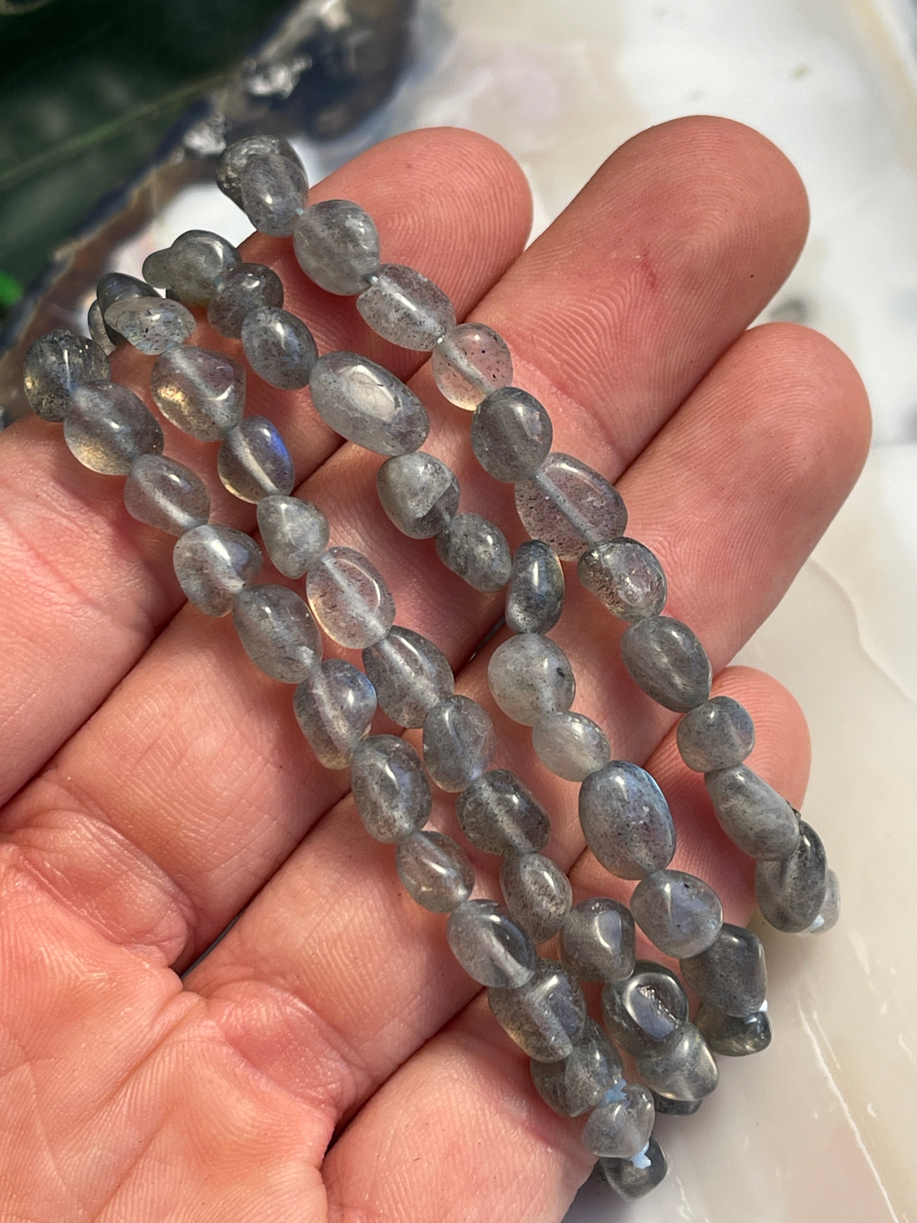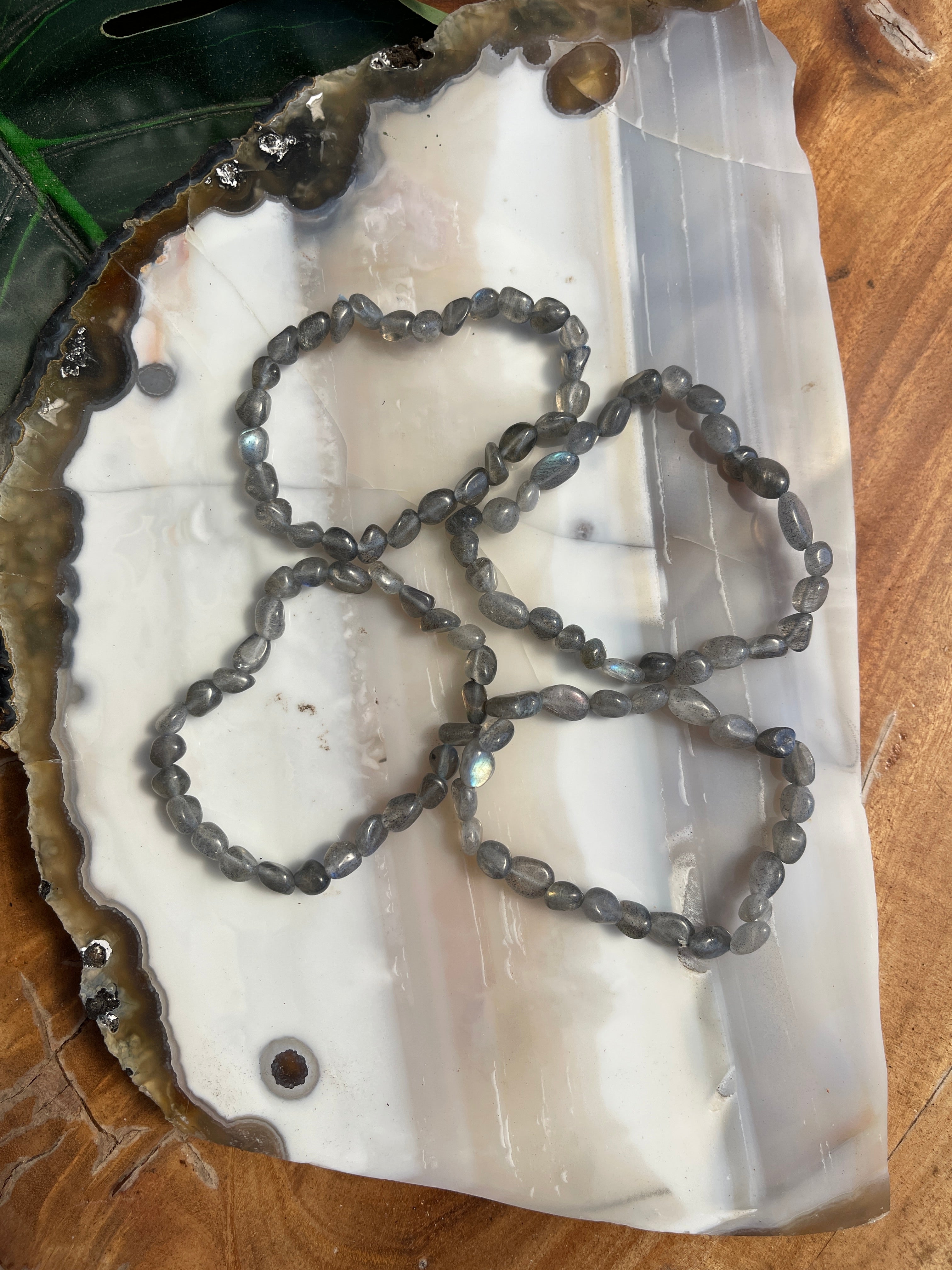 Elastic jewellery pieces should not be worn in the water (Ocean, Shower ect.) and taken off at night when sleeping (trust me.... trying to find beads that have scattered through a bed is not fun). Also, try to limit the amount of times they are stretched to full length, as this can cause excess wear and fraying on the elastic.