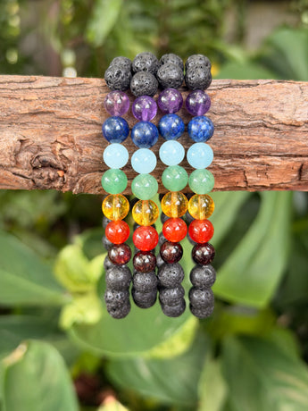 Our Chakra Bracelets are handcrafted with care from natural Garnet, Carnelian, Citrine, Aventurine, Aquamarine, Lapis Lazuli, and Amethyst.