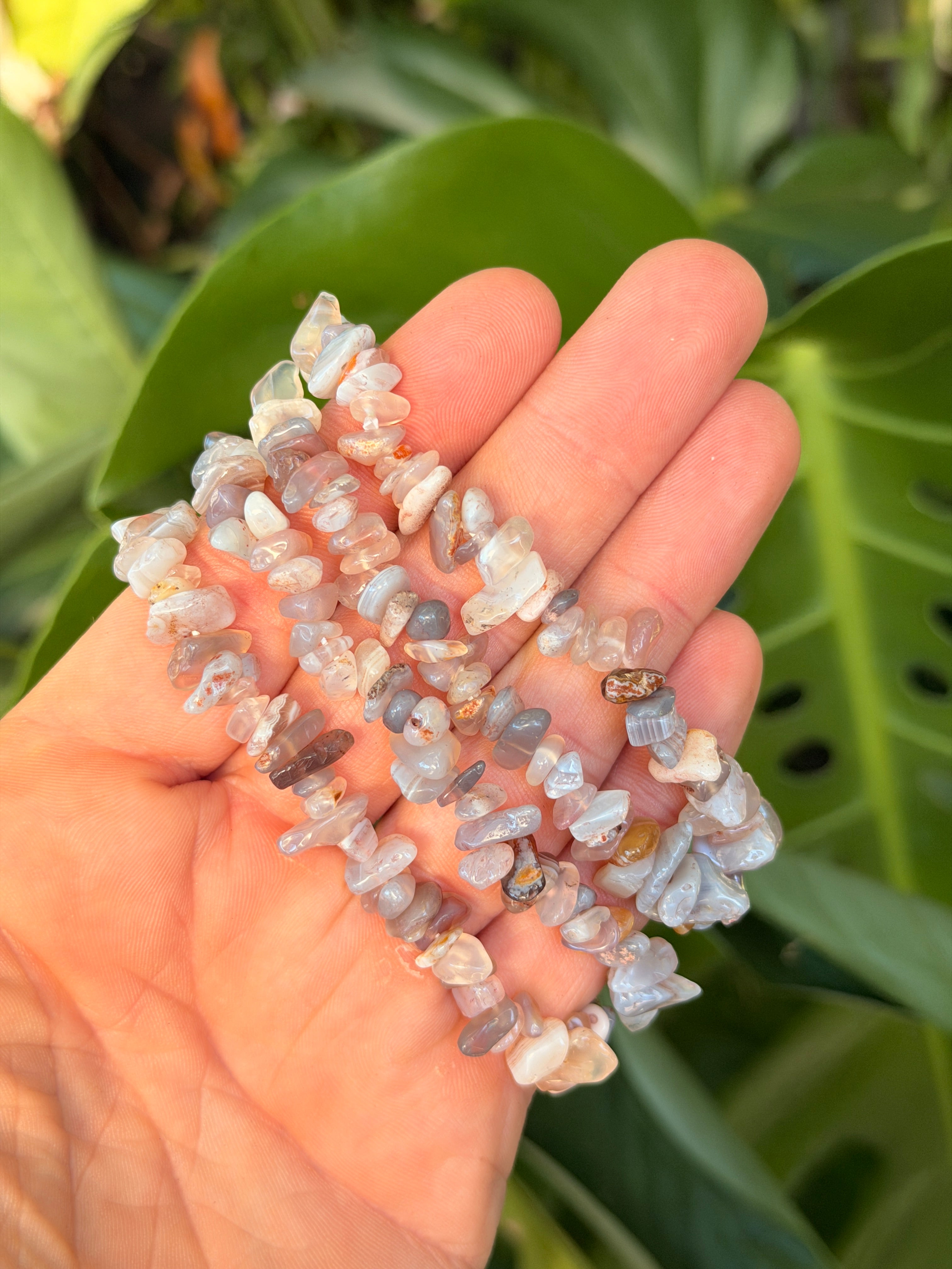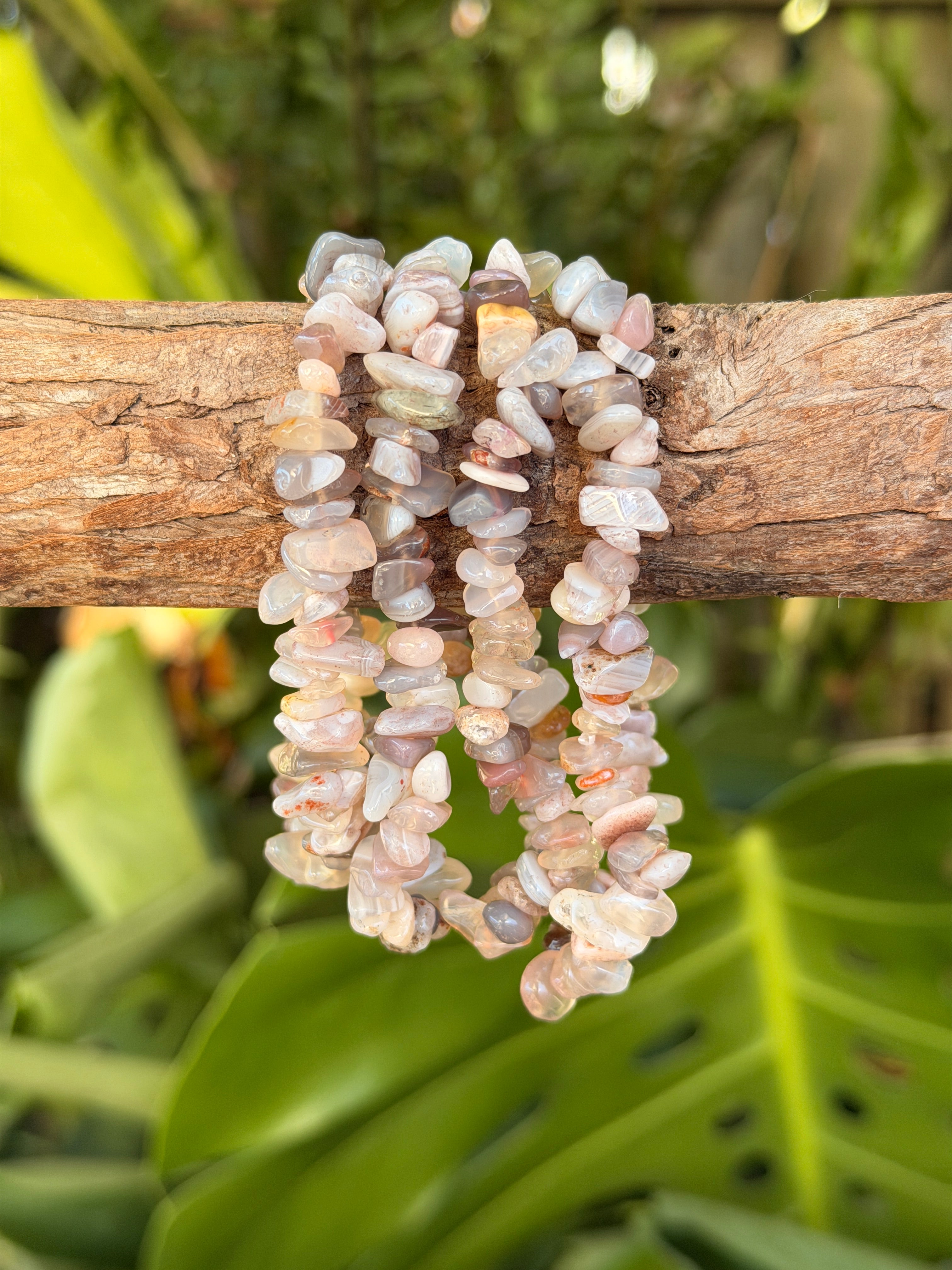 Elastic jewellery pieces should not be worn in the water (Ocean, Shower ect.) and taken off at night when sleeping (trust me.... trying to find beads that have scattered through a bed is not fun). Also, try to limit the amount of times they are stretched to full length, as this can cause excess wear and fraying on the elastic.