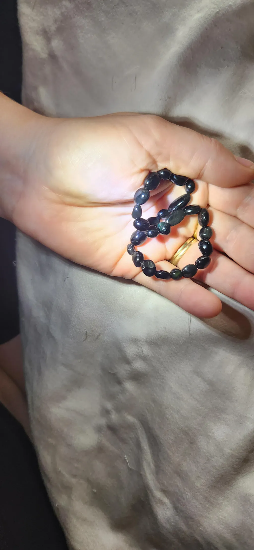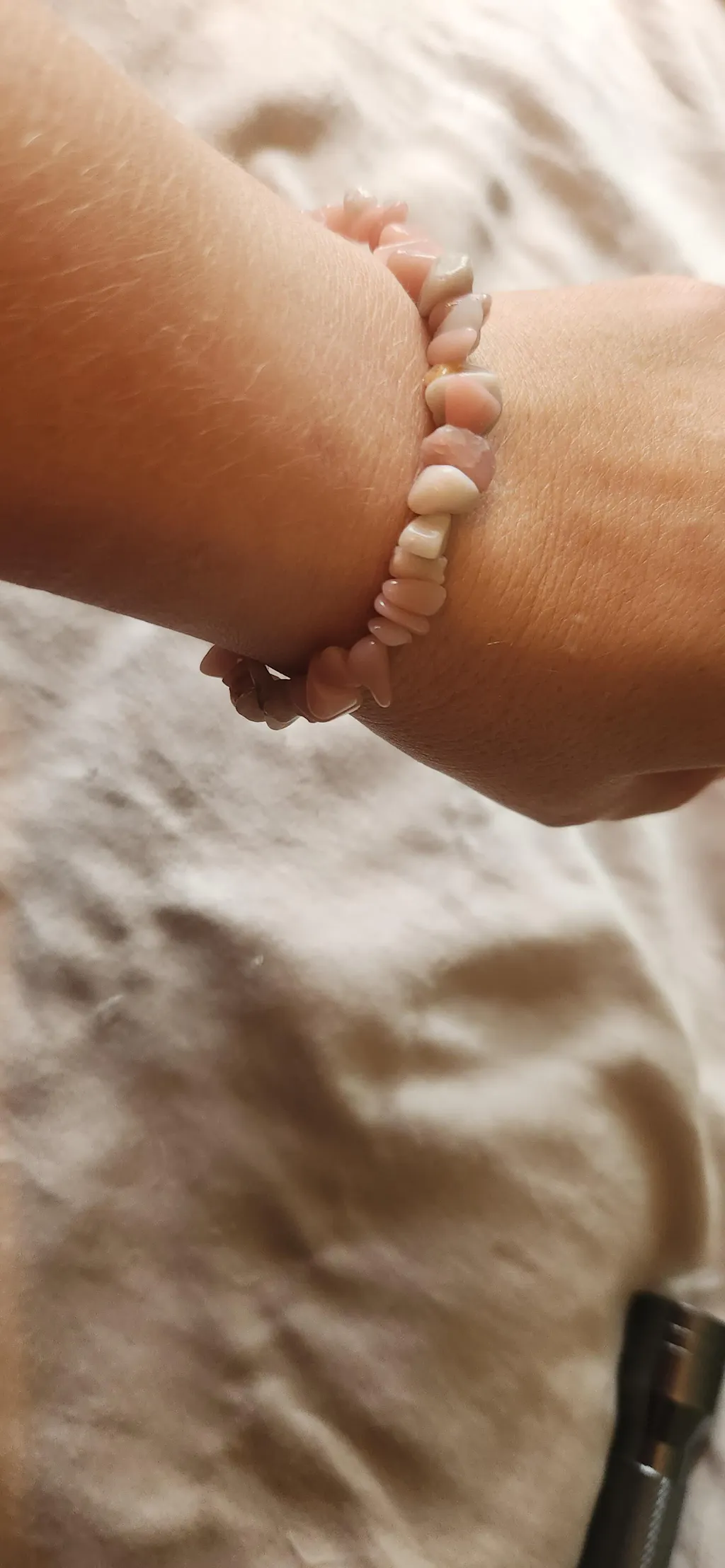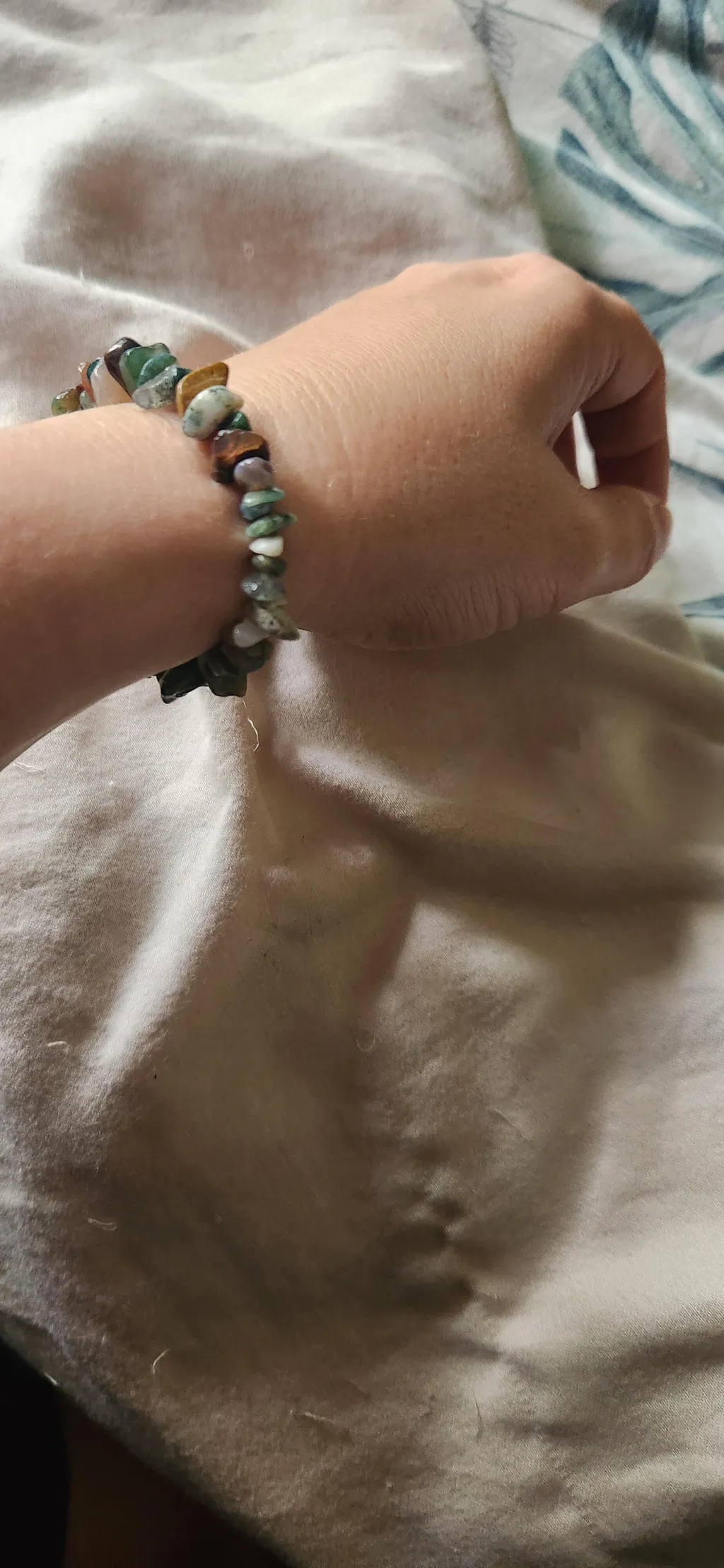 Elastic jewellery pieces should not be worn in the water (Ocean, Shower ect.) and taken off at night when sleeping (trust me.... trying to find beads that have scattered through a bed is not fun). Also, try to limit the amount of times they are stretched to full length, as this can cause excess wear and fraying on the elastic.